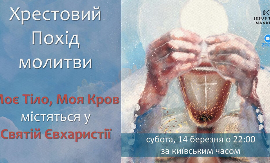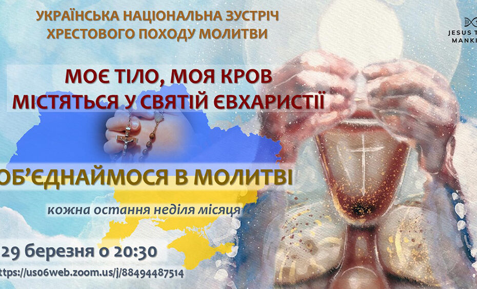 Слава Ісусу Христу! Дорогий молитовний воїне, Запрошуємо вас взяти участь в українських національних зустрічах Хрестового Походу молитви Місії “Ісус до людства”, які відбуваються в кожну останню неділю місяця і які покликані об’єднати усіх молитовних воїнів з різних молитовних груп Хрестового Походу. неділя, 29 березня 2026 року о 20:30 за київським… Читати далі »НАЦІОНАЛЬНА ЗУСТРІЧ ХРЕСТОВОГО ПОХОДУ МОЛИТВИ МІСІЇ “ІСУС ДО ЛЮДСТВА” – МОЄ ТІЛО, МОЯ КРОВ МІСТЯТЬСЯ У СВЯТІЙ ЄВХАРИСТІЇ