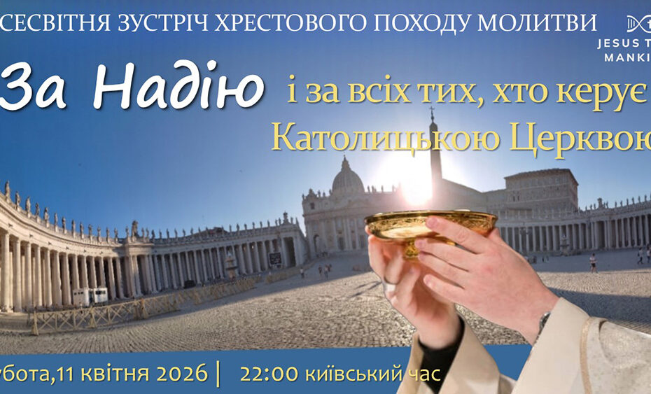 Аве Марія! Мир вам! Запрошуємо вас приєднатись до одногодинної молитовної зустрічі Хрестового Походу “Ісус до людства” в суботу, 11 квітня 2026, о 22:00 за київським часом. Тема цього місяця: ЗА НАДІЮ І ЗА ВСІХ ТИХ, ХТО КЕРУЄ КАТОЛИЦЬКОЮ ЦЕРКВОЮ Приєднатись за посиланням: https://bit.ly/EuropeanRegionPrayer2025 Meeting ID: 88389458835 Наша Матір Спасіння каже в… Читати далі »Всесвітня зустріч Хрестового Походу Молитви – За надію і за всіх тих, хто керує Католицькою Церквою