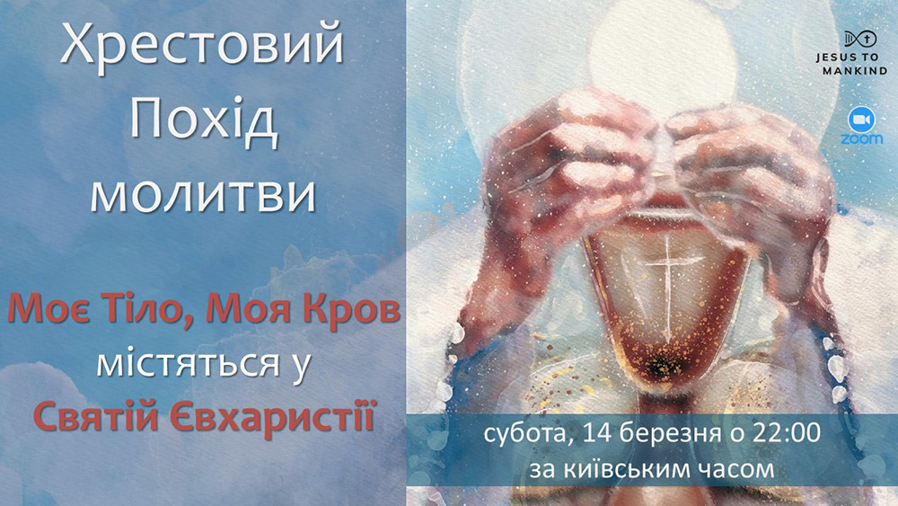 Запрошуємо вас приєднатися до міжнародної молитовної зустрічі Хрестового Походу Місії “Ісус до людства”, яка відбудеться у суботу, 14 березня 2026 року, о 22:00 за київським часом.
